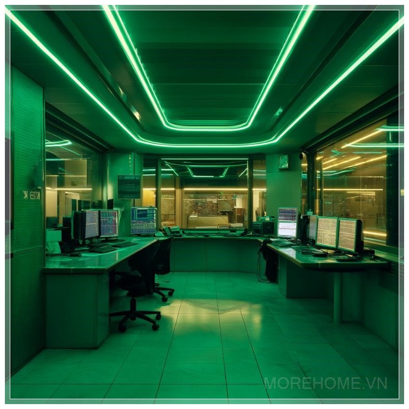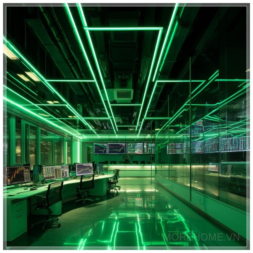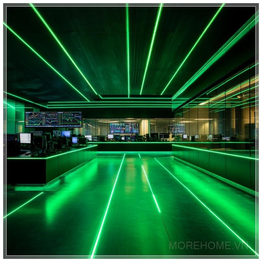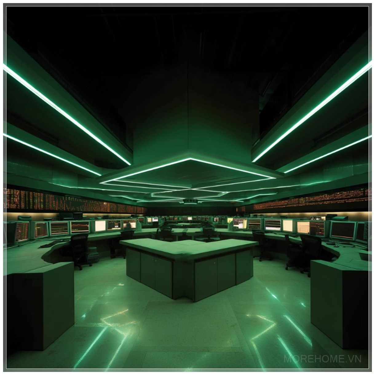 Trong một không gian phòng giao dịch đầy ấn tượng, màu xanh neon rực rỡ chiếm ưu thế, tạo ra một bầu không khí căng thẳng và đầy năng lượng. Những dải ánh sáng neon xanh lá phủ đầy các bức tường, đường nét sắc nét và rõ ràng như một dấu hiệu rõ ràng của sự hiện đại và công nghệ cao. Mỗi góc phòng đều được chiếu sáng bởi ánh sáng xanh, làm nổi bật những đường cong và góc cạnh sắc nét của không gian, tạo nên một cảm giác như đang ở trong một thế giới số hiện đại.