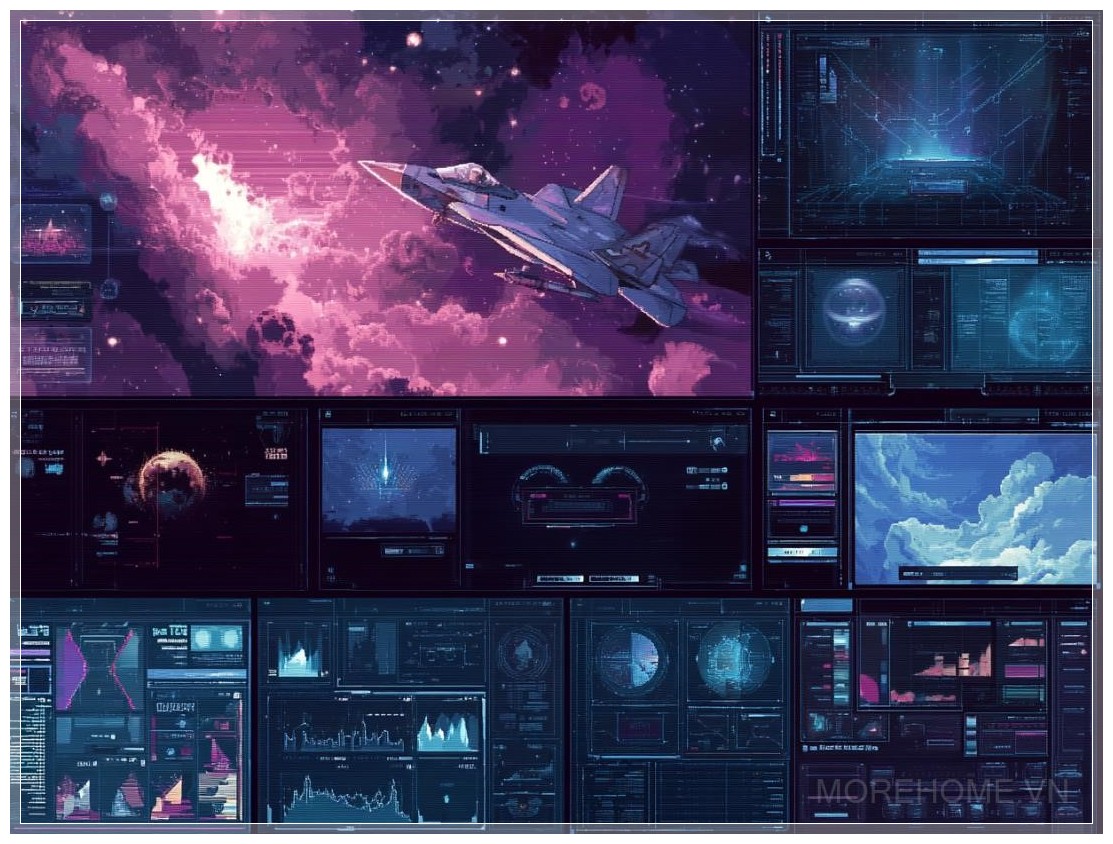 Pixel art sci-fi game moodboard, educational space exploration game, astronaut piloting F-22 Raptor-inspired spacecraft through solar system, vibrant cosmic nebulae backgrounds, retro arcade UI with scientific data overlays, holographic AI companion, planetary physics visualizations, deep space blues/purples with neon accents, NASA-inspired imagery, child-friendly astronomical phenomena, 2D game assets, Pygame --ar 4:3 --profile rfksrjg --v 7.0