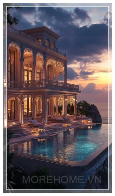 Bể bơi vô cực lấp lánh dưới ánh hoàng hôn, dòng nước như dải lụa mềm mại chảy từ trên xuống, phản chiếu ánh sáng ấm áp của mặt trời lặn. Được bao phủ bởi những ánh đèn ấm áp, không gian trở nên huyền bí, mang lại một cảm giác thanh thản và xa hoa. Mỗi chi tiết trong căn biệt thự đều được chế tác tinh xảo, từ những đường nét mềm mại của tường đá cho đến sự uyển chuyển trong thiết kế không gian, tạo nên một bức tranh hoàn hảo của sự sang trọng và thanh thoát.
