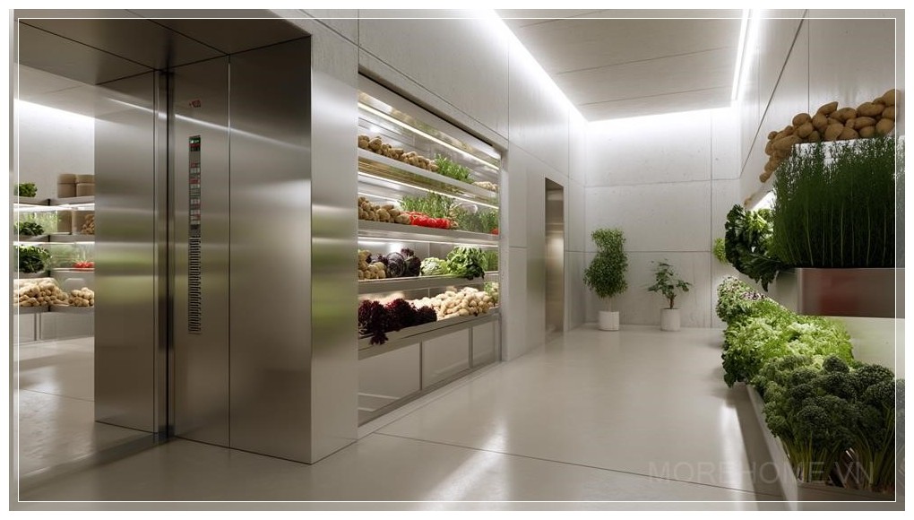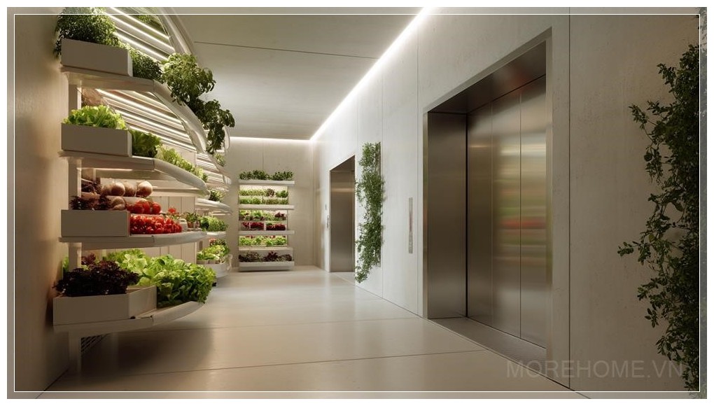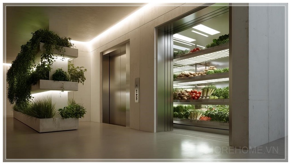 Những bức tường xung quanh thang máy được làm từ bê tông trắng mờ, mang lại vẻ đẹp tối giản nhưng không kém phần hiện đại. Bề mặt bê tông mịn màng và lạnh lẽo, tạo nên sự tương phản hoàn hảo với sự sống động của các cây trồng. Cảm giác như không gian này không chỉ là một phương tiện di chuyển mà còn là một tác phẩm nghệ thuật hiện đại.