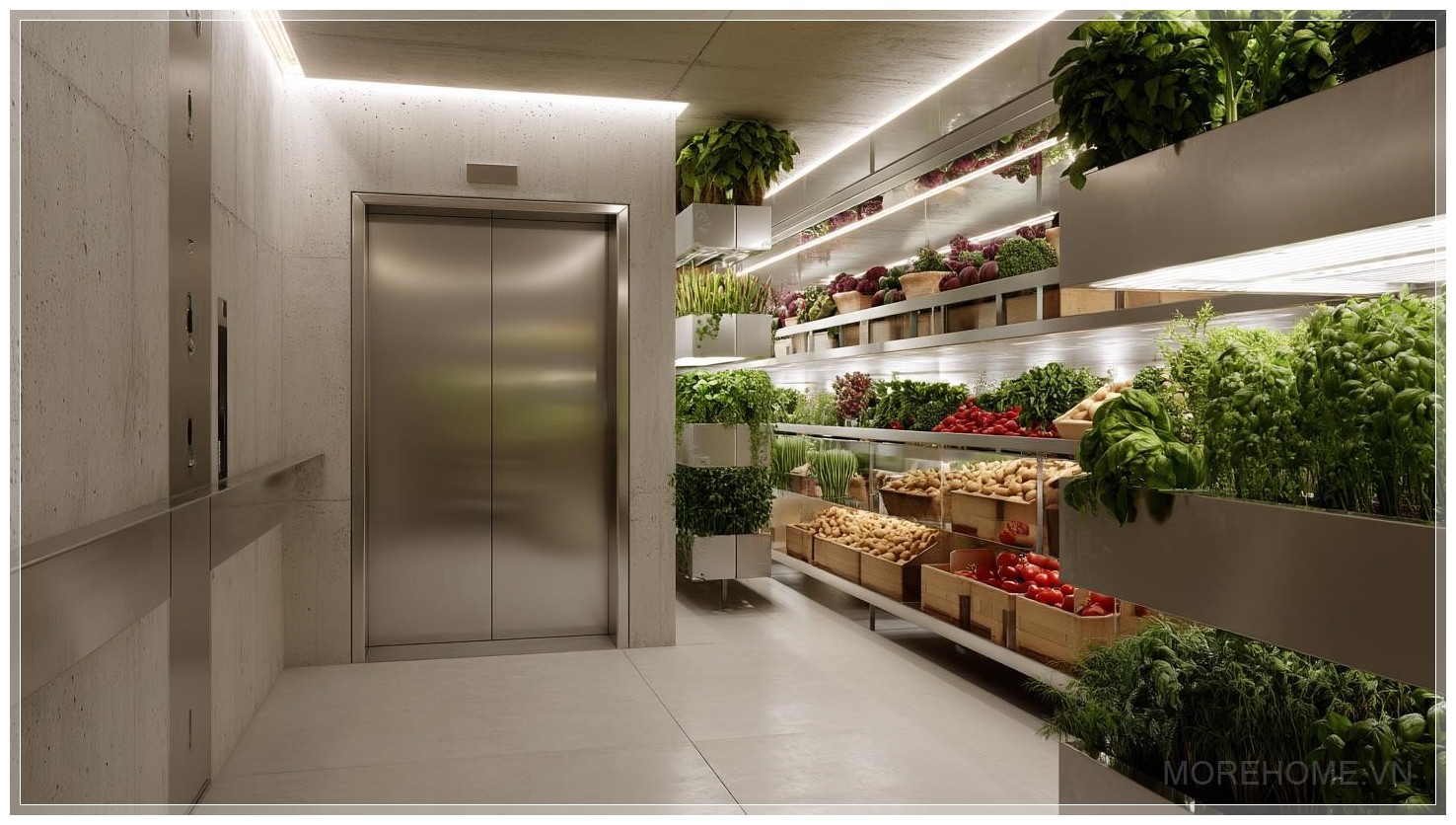 Bên trong thang máy, một cảnh tượng bất ngờ hiện ra: những cây trồng như khoai tây, cà chua, và xà lách đang tươi tốt, tạo nên một không gian sống động và đầy sức sống. Mặc dù không gian này nhỏ bé, nhưng từng loại cây đều thể hiện vẻ đẹp tự nhiên của mình, từ lá xà lách xanh mướt đến những quả cà chua đỏ mọng nước. Tất cả đều được trồng trong các thùng nhỏ, chăm sóc cẩn thận, như một khu vườn thu nhỏ giữa lòng thành phố.