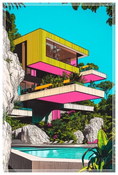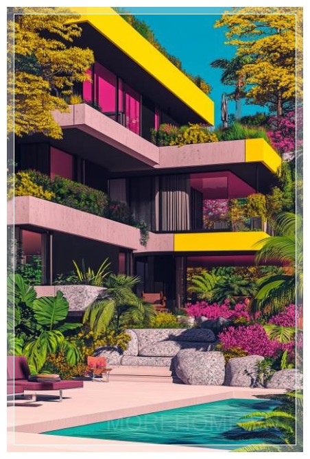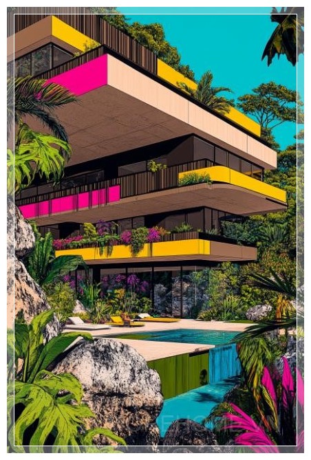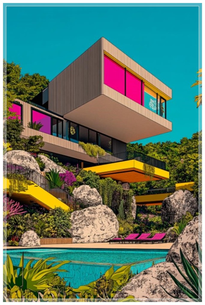 Các lớp đá dựng lên những khối vững chắc và mạnh mẽ, làm nổi bật vẻ đẹp thiên nhiên của khu rừng xung quanh. Mặt ngoài của tòa nhà gợi nhớ đến một bức tranh thiên nhiên được cắt xén khéo léo, với các ban công lồi ra (cantilever) được bao phủ bởi đá thô và cây cối xanh mướt. Những cây xanh không chỉ tạo ra một không gian sống hòa hợp với thiên nhiên mà còn mang đến một cảnh quan đầy sức sống, giúp tòa nhà như một phần của môi trường xung quanh.