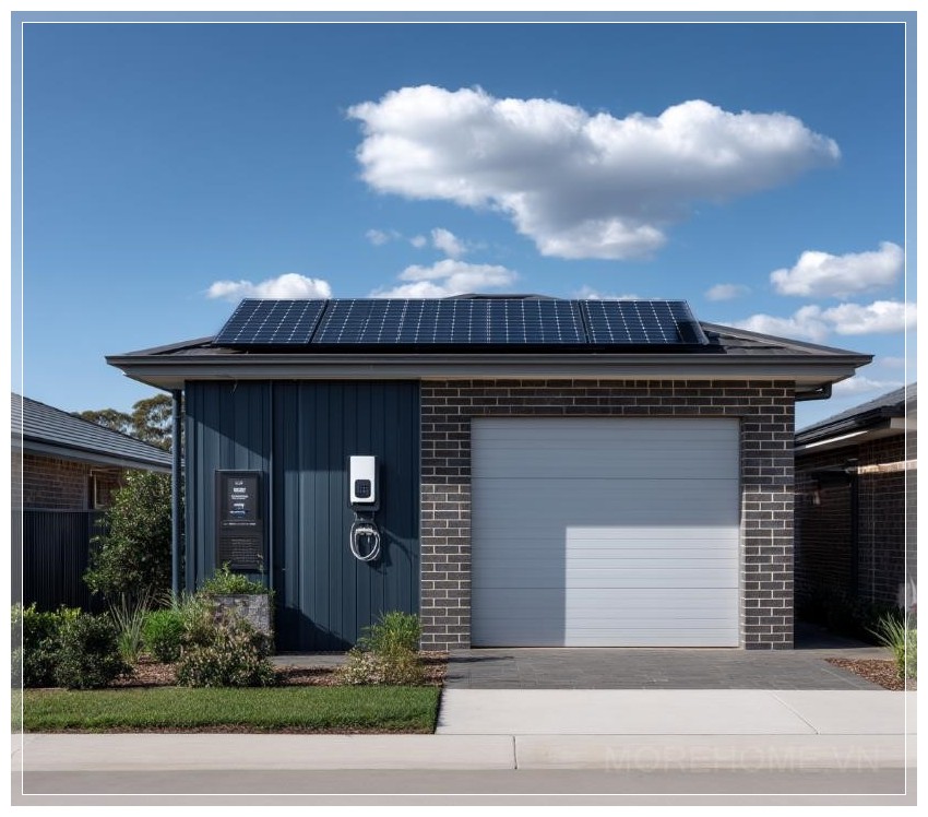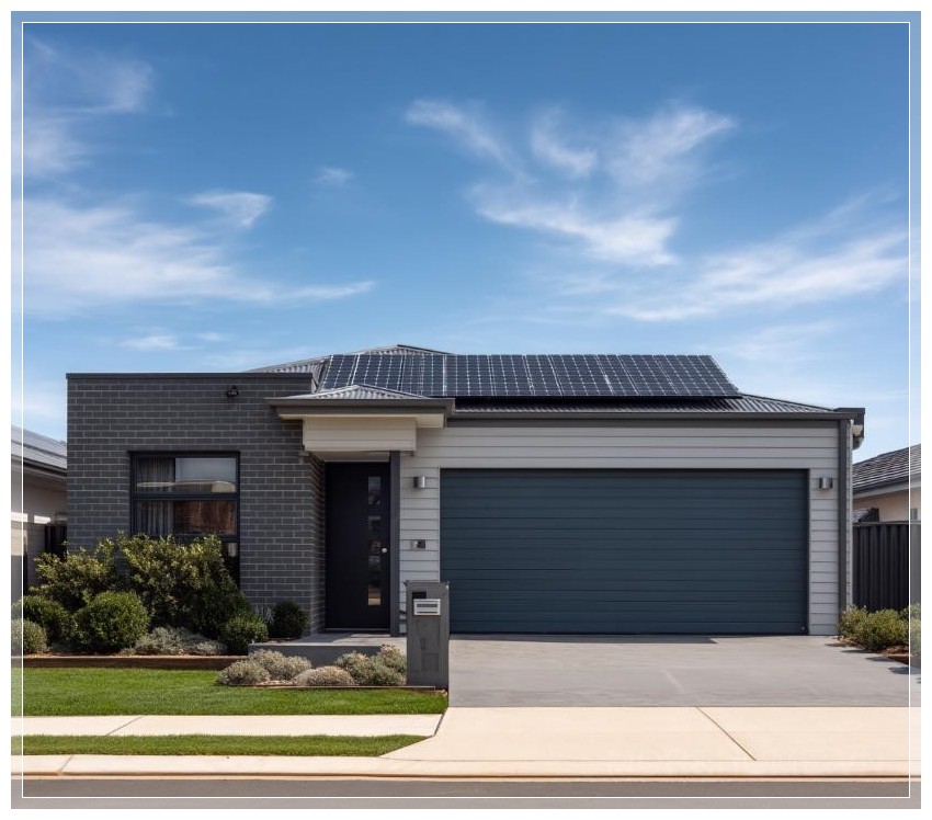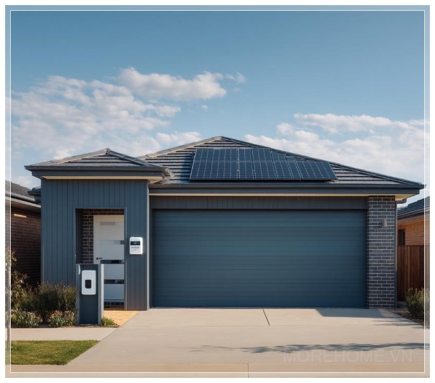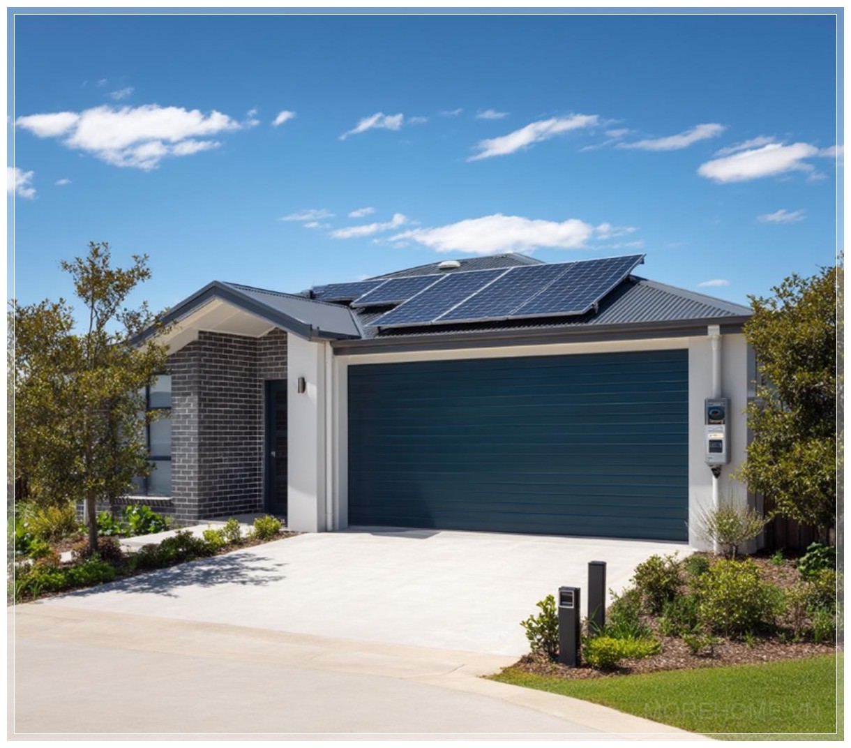 Hình ảnh một ngôi nhà kiểu Australia hiện đại nổi bật dưới ánh nắng mặt trời trong ngày hè rực rỡ. Mái nhà được lắp đặt các tấm pin năng lượng mặt trời, phản chiếu ánh sáng chói chang, mang lại cảm giác bền vững và hiện đại. Trước cửa, một hộp công tơ năng lượng được lắp đặt gọn gàng, cho thấy sự kết hợp giữa công nghệ và tiện ích trong việc quản lý năng lượng của ngôi nhà.