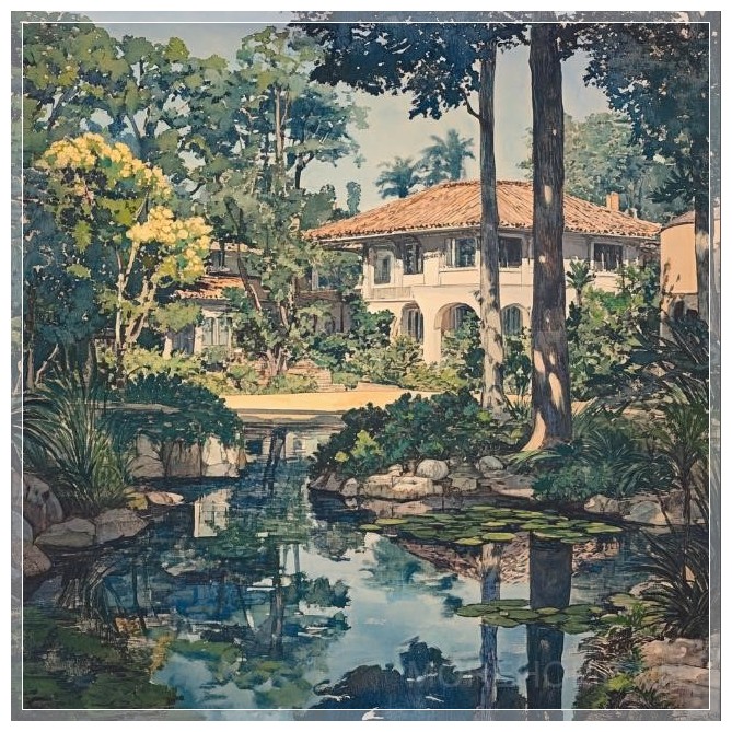 Không gian xanh mướt của những khu vườn biệt thự dường như được phóng đại lên qua các nét vẽ tỉ mỉ, mỗi chiếc cây, mỗi cánh hoa đều toát lên vẻ đẹp tinh tế của tự nhiên. Những đường viền của những bụi cây và cảnh quan xung quanh được thể hiện bằng các nét bút thanh thoát, mang lại cảm giác như thể mỗi cảnh vật trong bức tranh đều đang sống động, thay đổi cùng ánh sáng thiên nhiên suốt ngày dài.