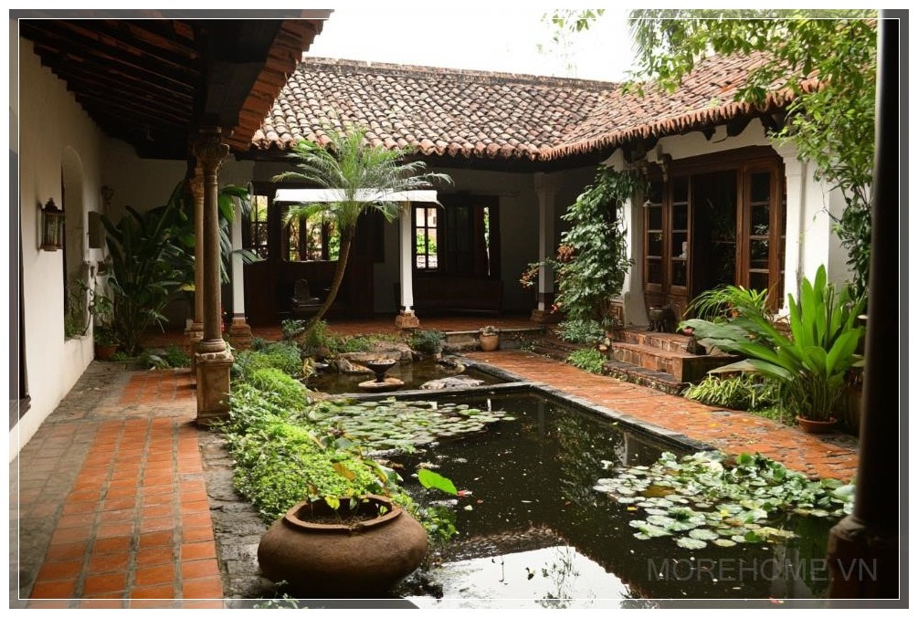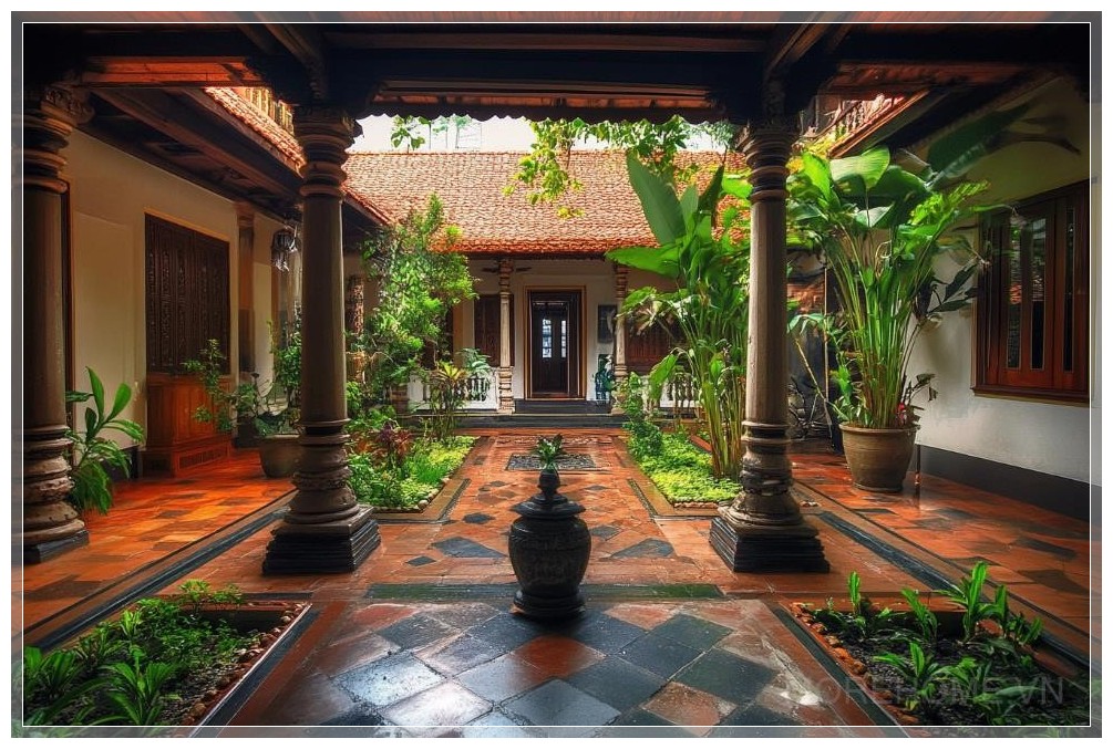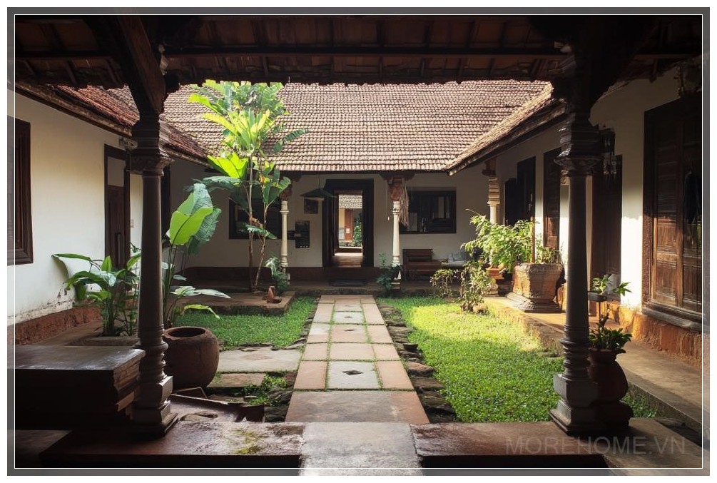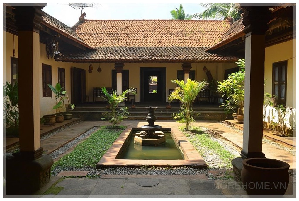 Với những mái nhà mái ngói đỏ rực rỡ và không gian mở, sân trong nhà Kerala là một không gian tuyệt vời kết nối con người với thiên nhiên. Đặc trưng của những ngôi nhà Kerala là sự kết hợp hài hòa giữa văn hóa cổ truyền và sự hiện đại trong cách bố trí không gian, đặc biệt là ở khu vực sân trong. Được bao quanh bởi những bức tường cao, sân trong không chỉ là nơi thư giãn, mà còn là một không gian để các gia đình tụ họp, trò chuyện và tận hưởng không khí trong lành.