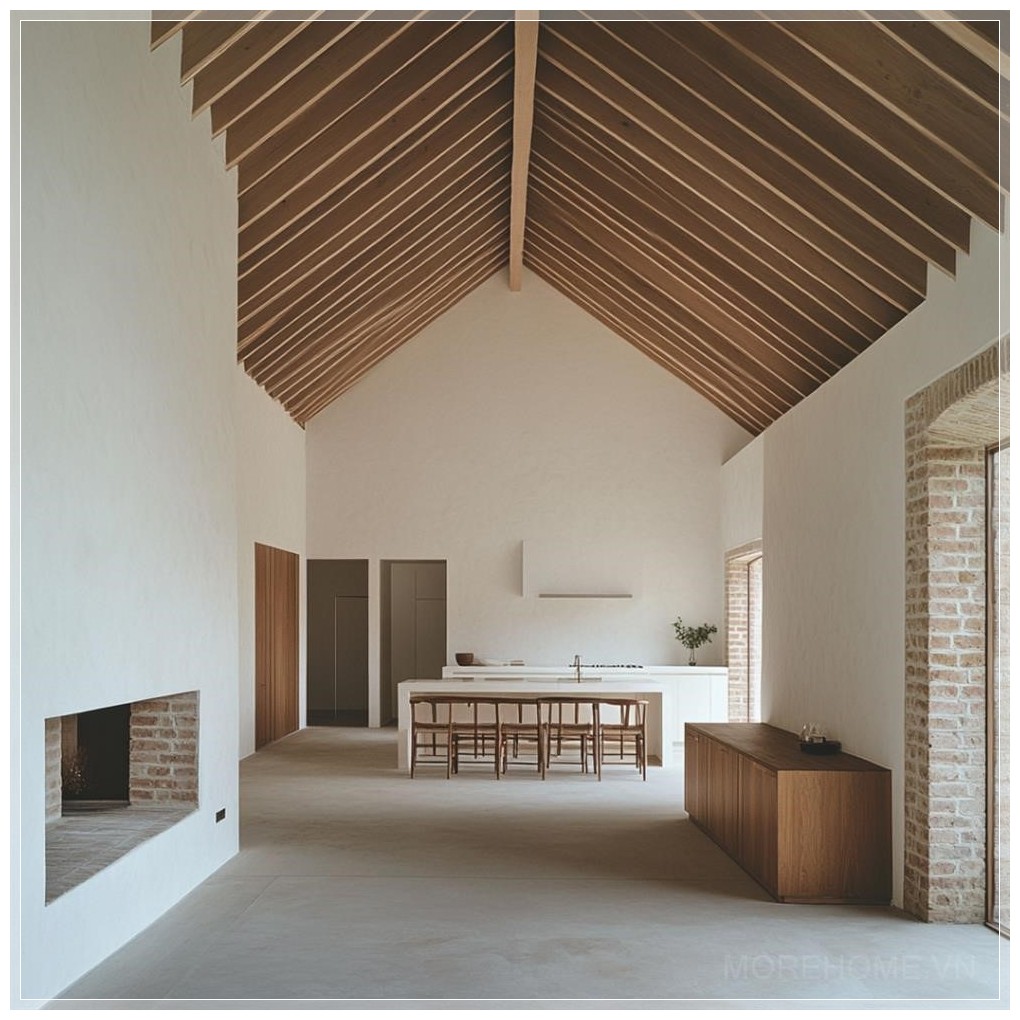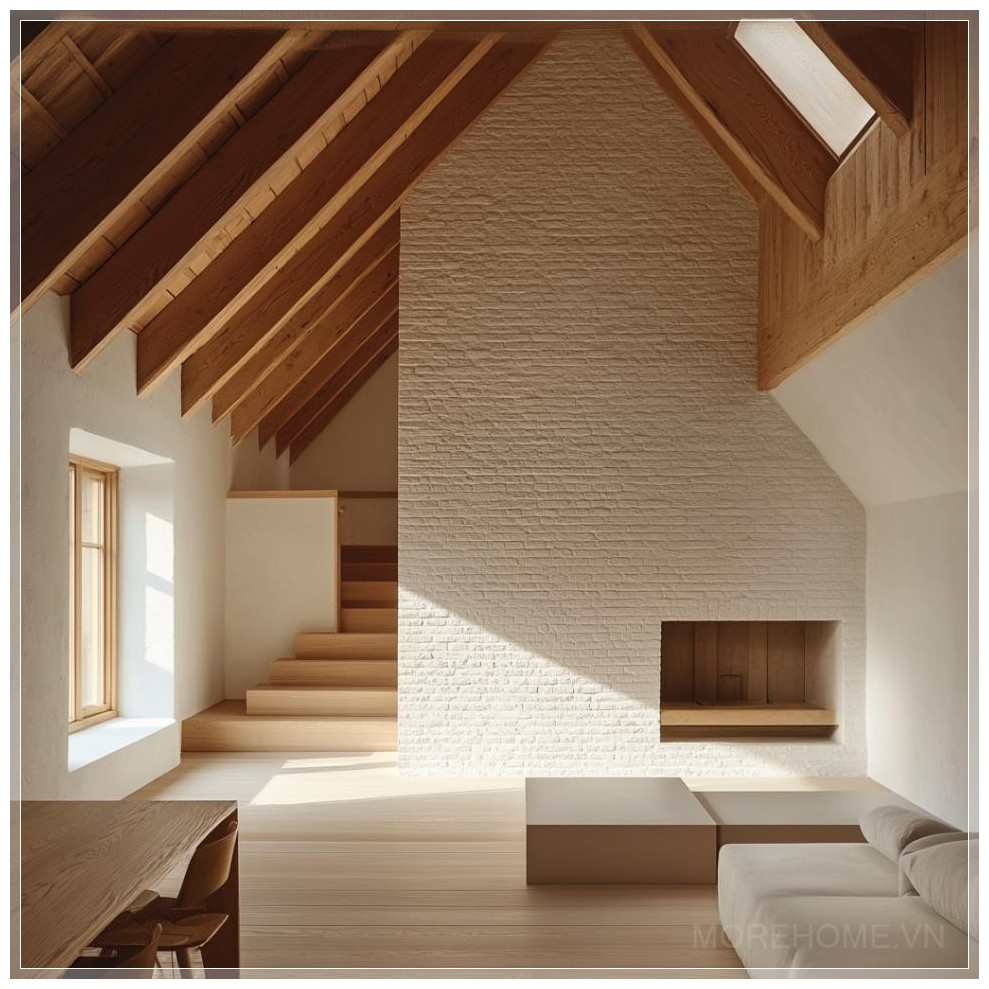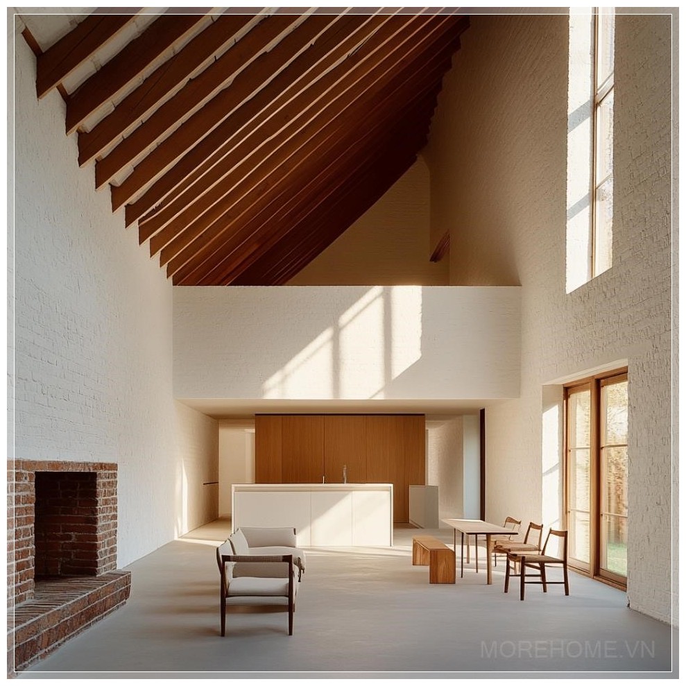 Ánh sáng nhẹ nhàng chiếu qua các ô cửa sổ lớn, làm nổi bật không gian rộng mở với những đường nét thanh thoát và tinh tế. Bên trong ngôi nhà mái nghiêng, sự kết hợp giữa gỗ ấm áp, tường thạch cao trắng mịn và những điểm nhấn gạch đỏ mang lại cảm giác ấm cúng nhưng không kém phần hiện đại.