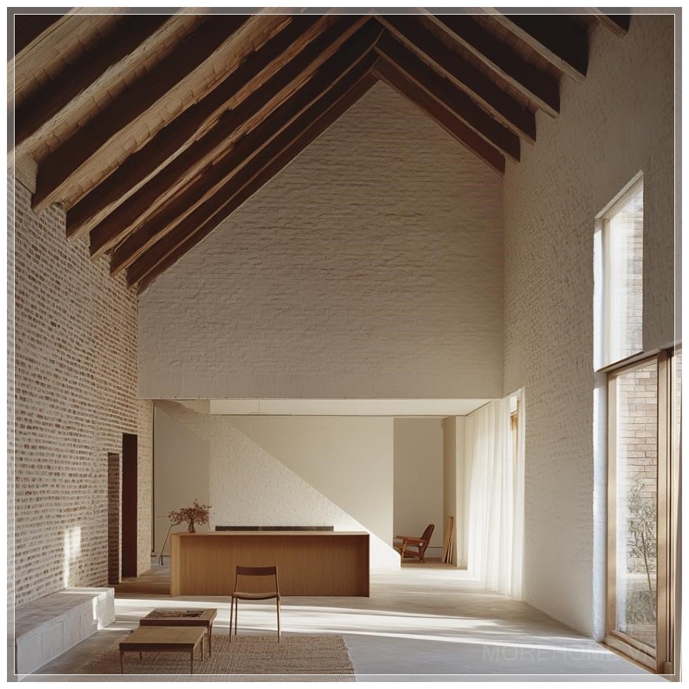 interior of a pitched roof house designed by john pawson with warm wood, white plaster, and brick accents