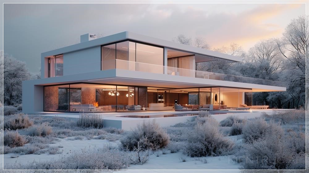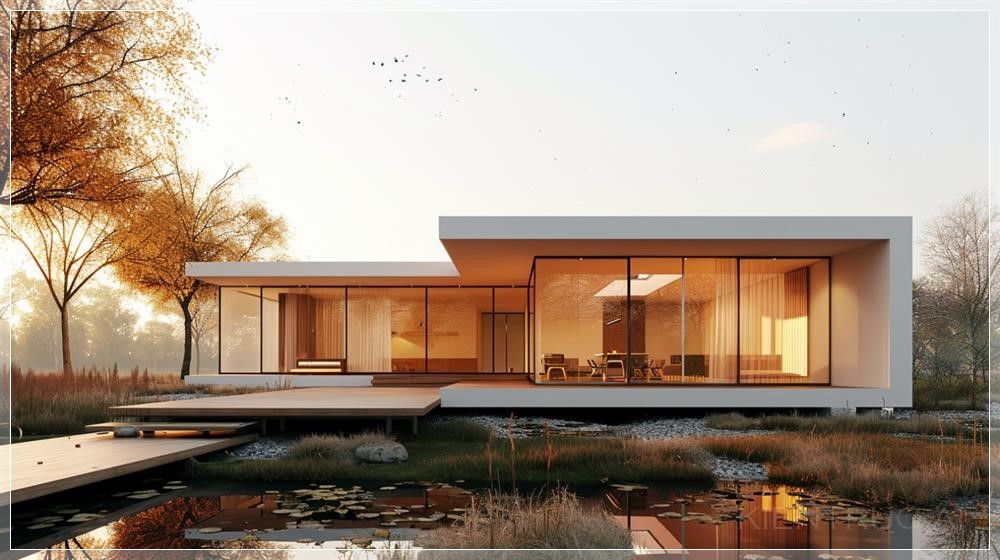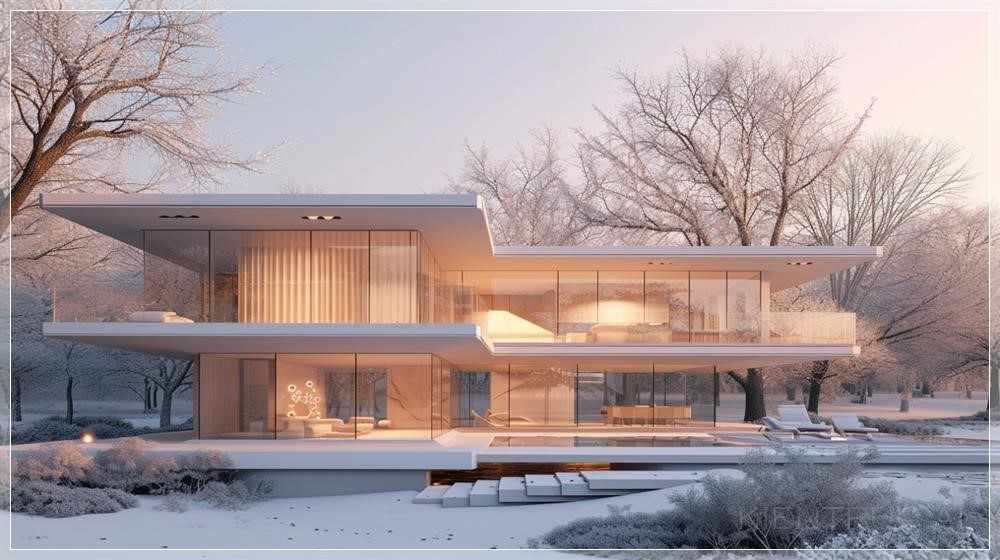 PROMPT: modern house in the middle of the countryside, in the style of luminous 3d objects, light white and amber, blurred, dreamlike atmosphere, chen zhen, light pink and white, glass as material, luxurious --ar 16:9 --iw 2 --s 150 --v 6.0 Ý Nghĩa: