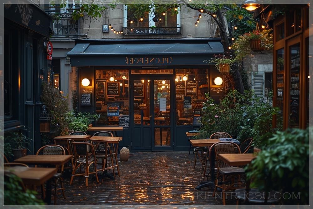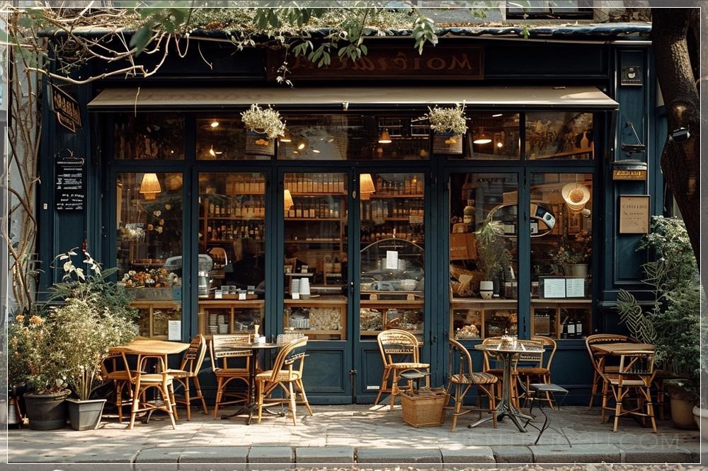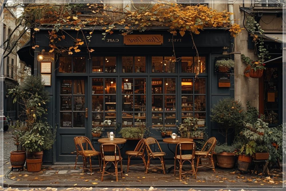 an outdoor café with some plants is being set up behind it, in the style of dark bronze and light beige, vignettes of paris, minimalist features, streetscape, minolta riva mini, high quality, asymmetrical framing --ar 3:2 --s 750 --v 6.0