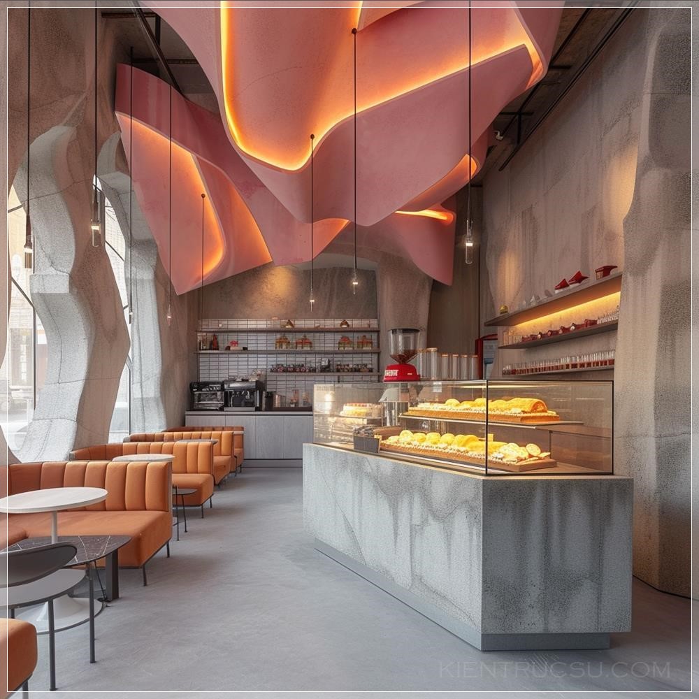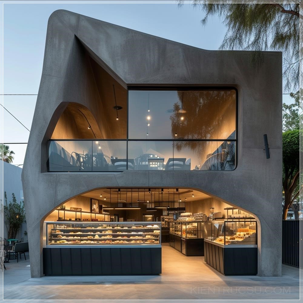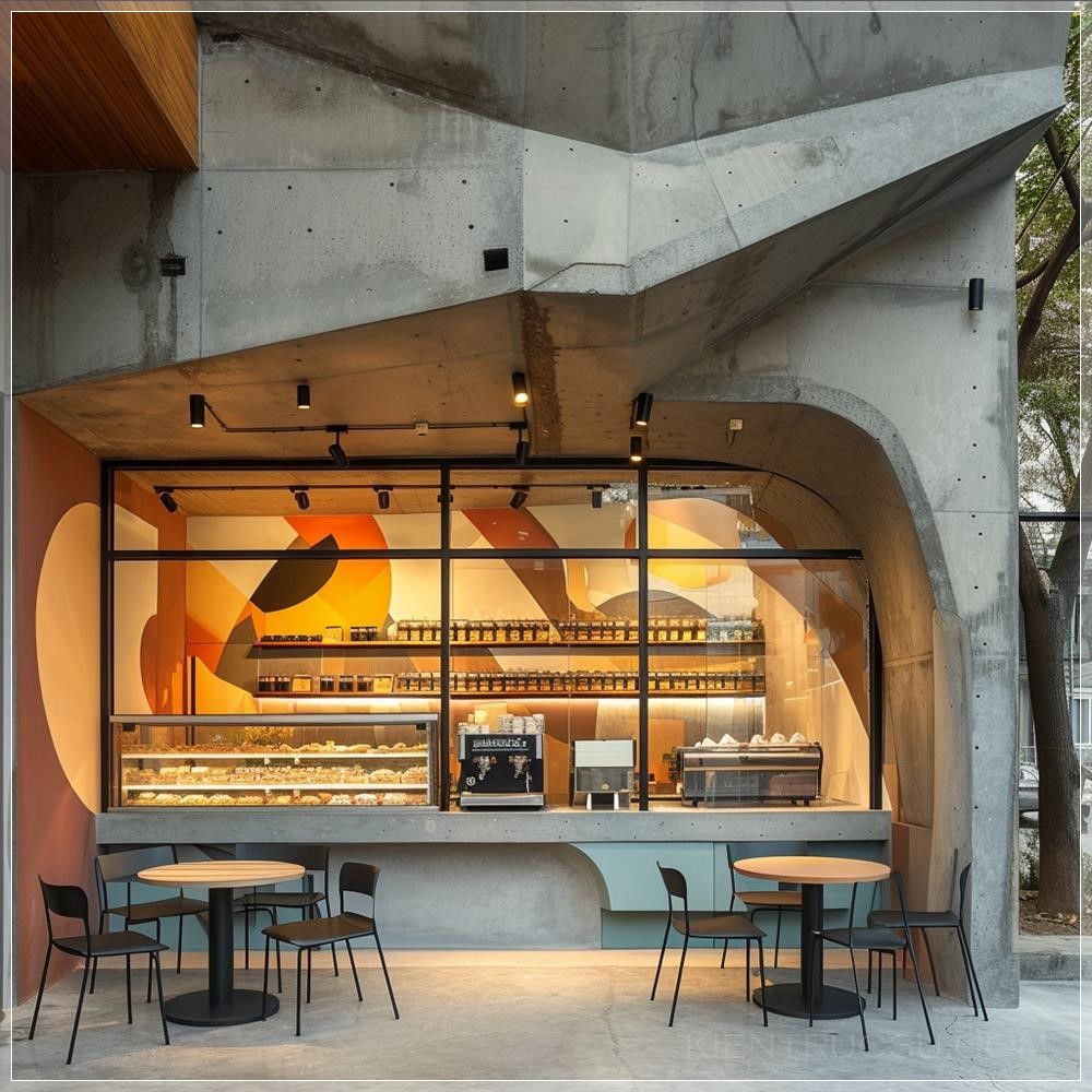 Imagine a cozy coffee and pastry shop where the warmth of a traditional café meets the visionary essence of retro-futurism, all encapsulated within the raw, expressive form of Brutalism. The shop's exterior boasts bold, geometric concrete shapes, creating a striking contrast against the softer, inviting glow of light from within. Inside, patrons are welcomed into a space that harmoniously blends the past and future: walls of rough, textured concrete softened by the warmth of amber lighting and vintage, mid-century modern furnishings. The seating area features a mix of plush, rounded sofas and sleek, metal-framed chairs, arranged to encourage intimate conversations among guests. The counter, a focal point of the shop, showcases a futuristic design with smooth curves and integrated, retro-styled appliances that seem both nostalgic and ahead of their time. Above, a large, abstract mural in vibrant colors brings a touch of whimsy to the Brutalist setting, inspired by the optimism of the 1960s space age. Throughout the shop, shelves and display cases of minimalist design exhibit an assortment of pastries and baked goods, their traditional appeal contrasting with the futuristic ambiance. This café is a haven for those who appreciate the art of coffee and the beauty of architecture, offering a unique experience that feels both comforting and intriguingly out of time. It's a place where the past's nostalgia, the present's comfort, and the future's excitement converge, inviting guests to linger over their coffee in a setting that feels like a glimpse into a utopian world where time stands still. --v 6.0 --chaos 1