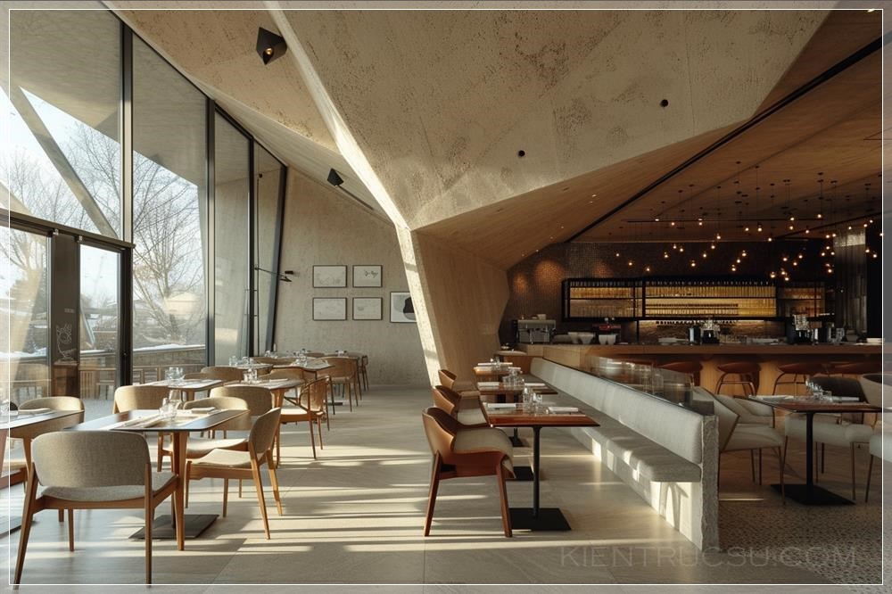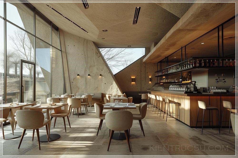 a photography contest, interior of a brutalist and contemporary restaurant in Andres Jaque style, the interior is beige concrete with rust orange colors with Nordic wooden chairs and tables, the geometry is domed but faceted with polygonal geometries, the floor is made of terrazzo in the same tones, Andrés Jaque architecture style, naturalistic light and shadow, the back of the restaurant is open and you can see the cliff of Cabo de Peñas and the sea, there is a certain fog in the environment, the color of the sky is spectacular because it dawns, epic atmosphere, the design of a restaurant inside, roof and faceted facades of complex geometry with wooden tables on a single ground floor, the entire geometry has polygonal:: facades inclined at angles of straight:: and pure cuts, in the style of naturalistic light and shadow, exquisite craftsmanship --v 6.0 --ar 3:2 --style raw --s 900