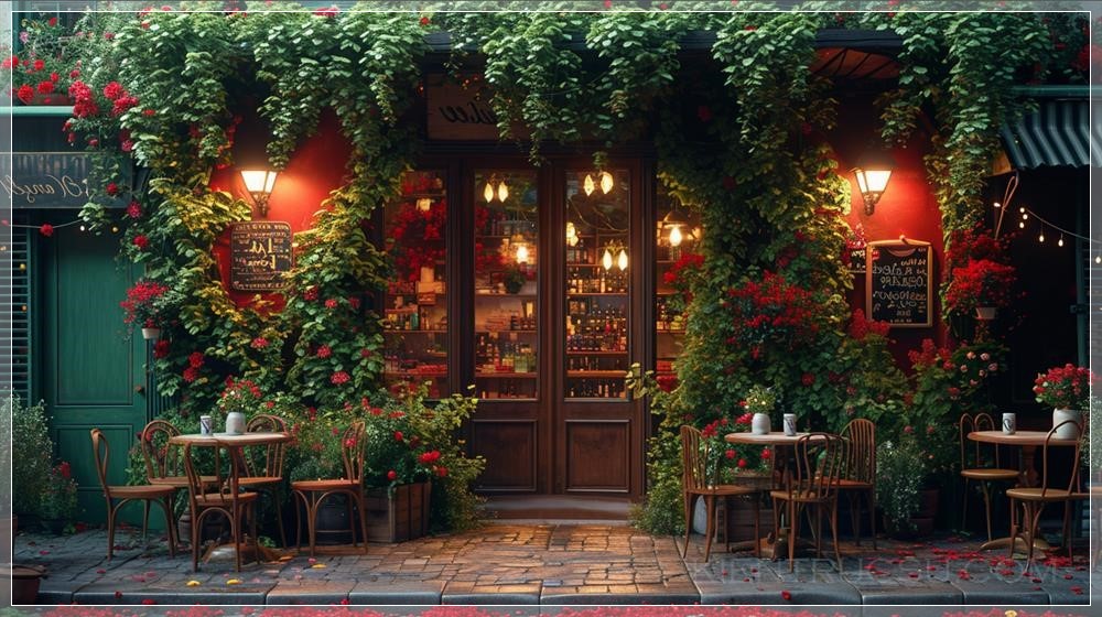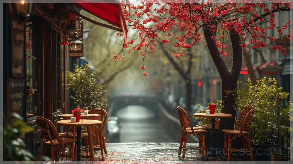 PROMPT: paris in spring food and drinks for a cafe by kaeley, in the style of uhd image, green and crimson, mysterious backdrops, 32k uhd, east village art, red, high resolution --ar 16:9 --s 750 --v 6.0 Ý Nghĩa: