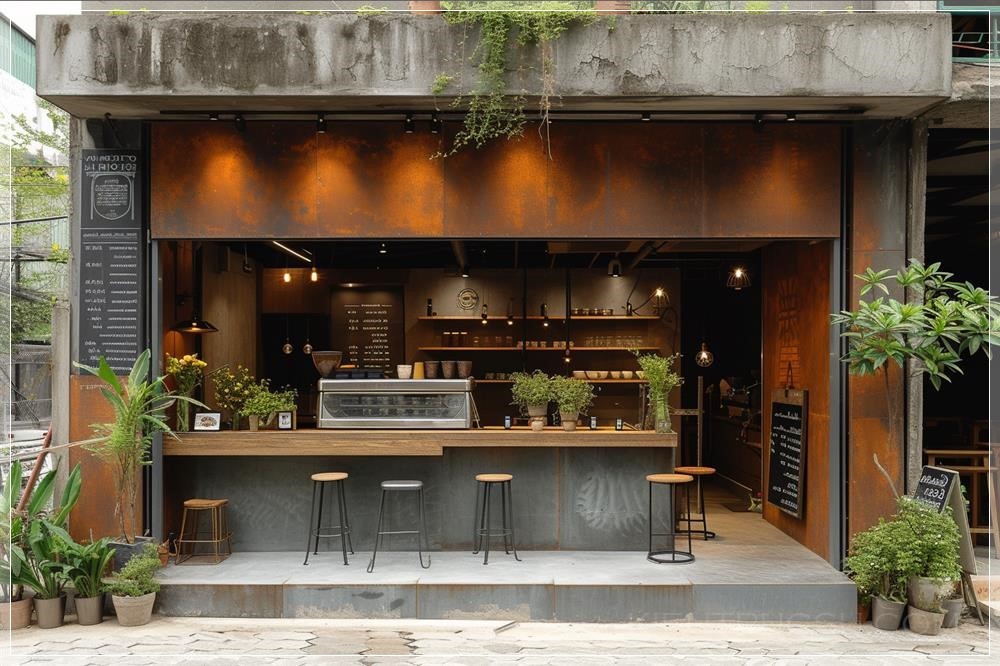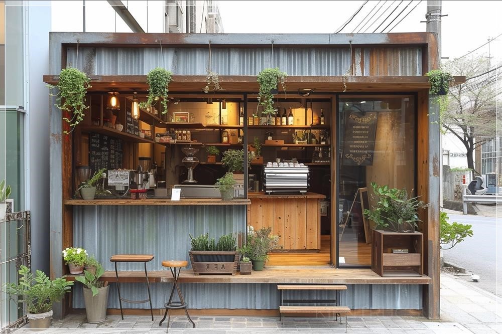 Picture a tiny coffee shop where old zinc is ingeniously incorporated into the design, marrying rustic appeal with modern simplicity. The shop features an open facade, inviting customers into a space where old zinc surfaces contrast with sleek, stainless steel accents and natural wood touches. The overall design aims for a minimalist yet warm environment, with plants adding a touch of greenery against the raw textures. Situated in a bustling market area, the coffee shop stands out as a testament to sustainable design practices, brought to life by a design firm known for their commitment to eco-friendly and innovative solutions. --ar 3:2 --s 200 --v 6.0