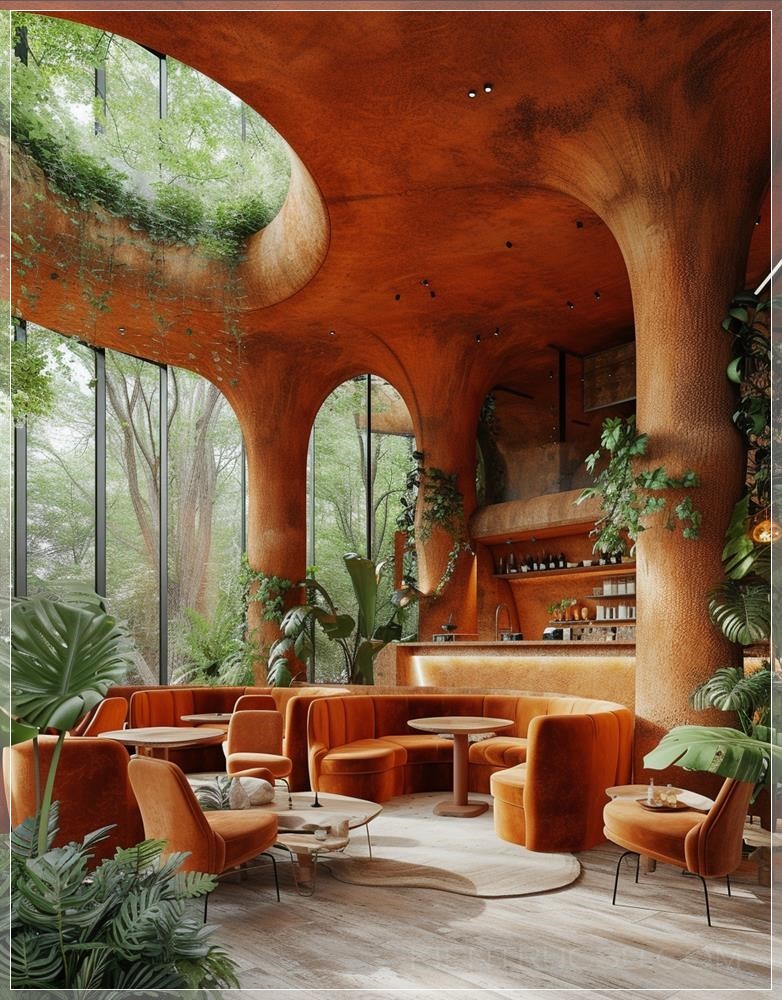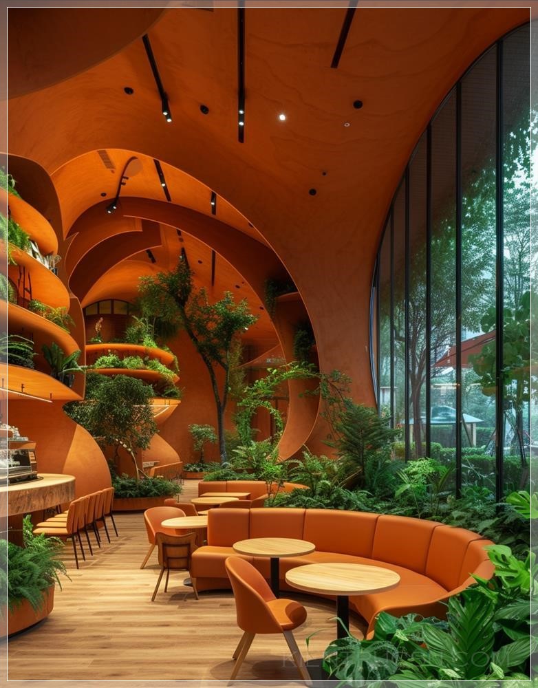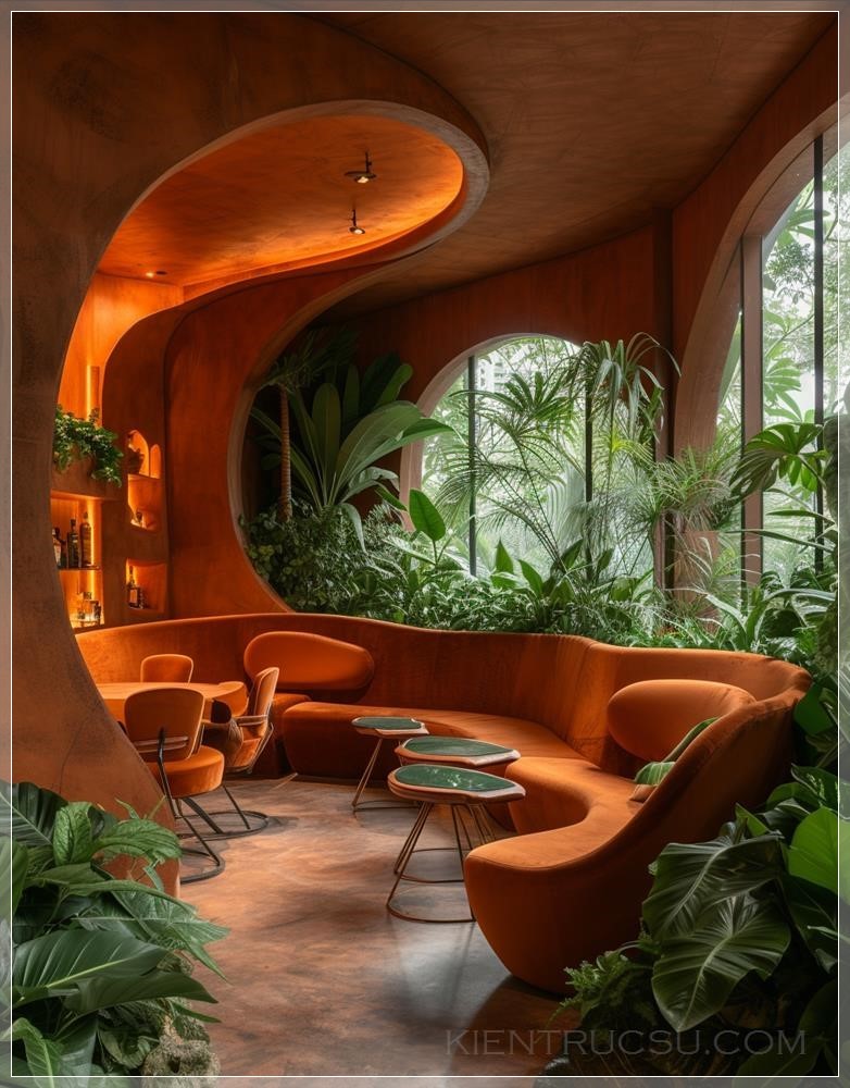 PROMPT: a curved cafelike lounge with a lot of greenery and chairs, in the style of light orange and brown, hajime isayama, elegant, emotive faces, contrasting lights and darks, terracotta, warm tones, wood --ar 25:32 --s 250 --v 6.0 Ý Nghĩa: