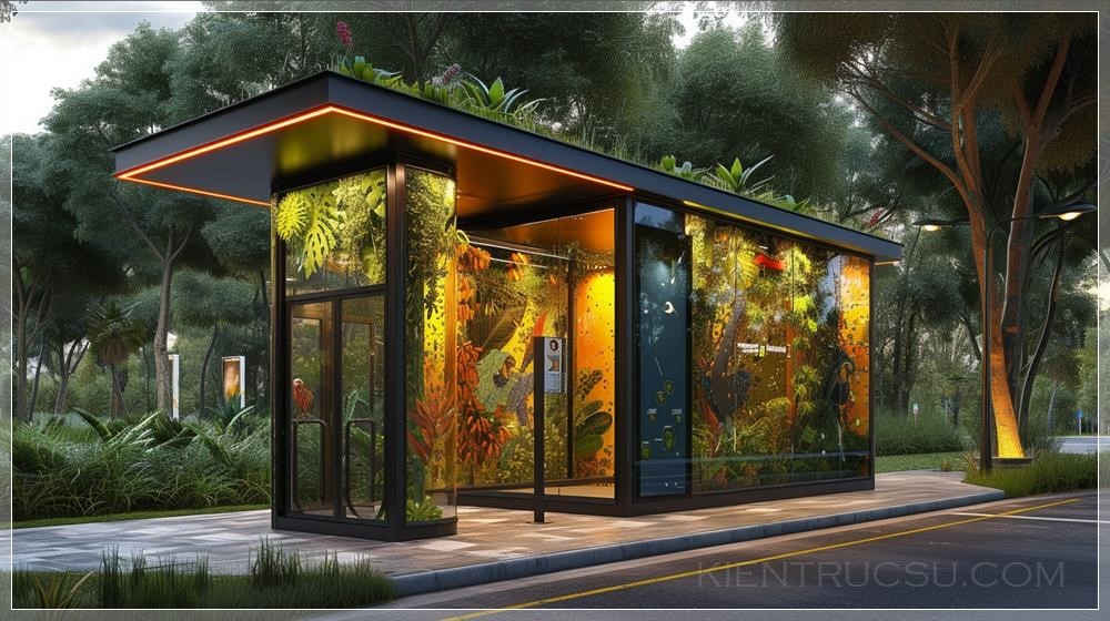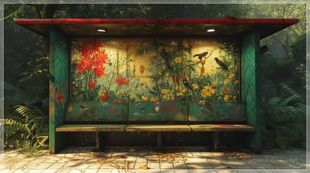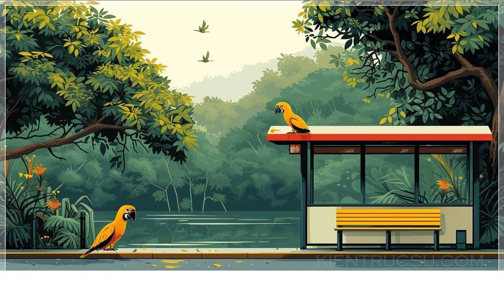PROMPT: create a Brazilian bus stop, and it is decorated with elements from the Brazilian cerrado. Trees, birds, water. --c 10 --ar 16:9 --s 250 --v 6.0 Ý Nghĩa: