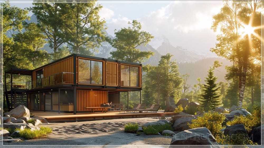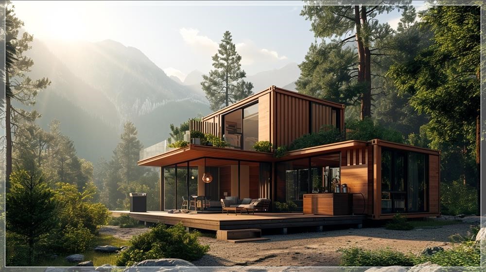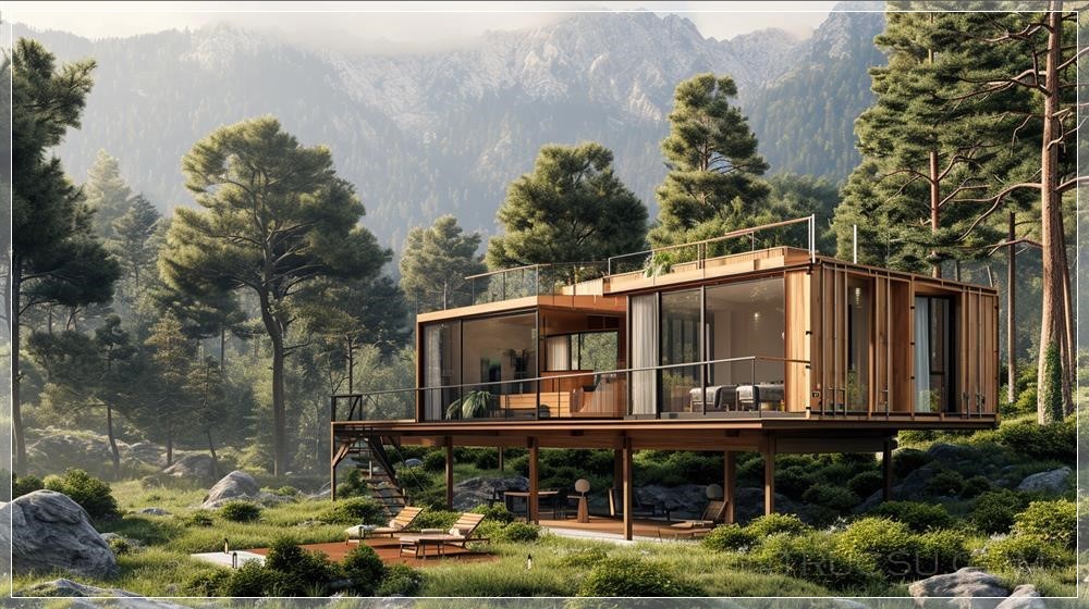 A photorealistic depiction of a two-level modular container home, 2.90m per level, nestled in a mountainous landscape. Rustic design with wooden accents, large terrace. Bright summer morning, sun rays filtering through trees, casting dynamic shadows. Created Using: ultra-realistic 3D rendering, mountain landscape background, warm and cool color contrast, natural wood textures, sunlight filtering, dynamic shadow effects, glibatree prompt, serene nature setting --ar 16:9 --v 6.0