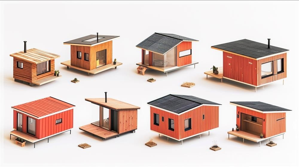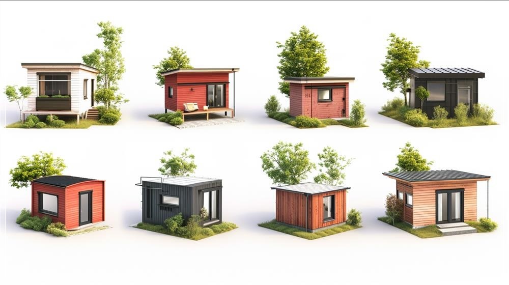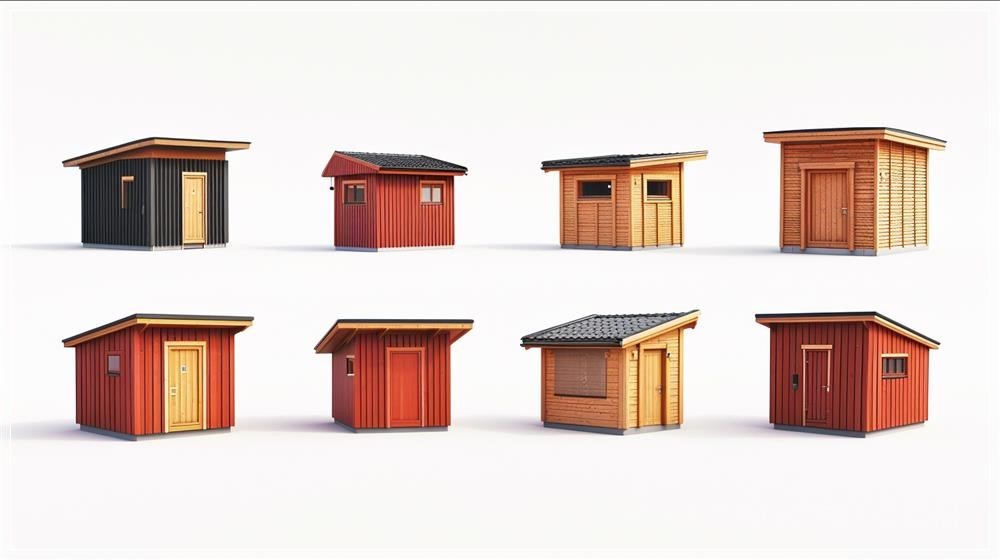 PROMPT: a series of different swedish modern garden cabins with a flat roof and gutter drip on one side and an exterior of raw red painted wood, solid white background, camerangle isometric, --ar 16:9 --v 6.0 Ý Nghĩa: