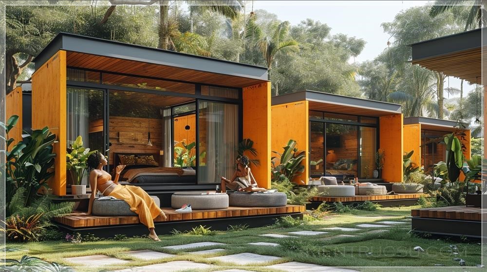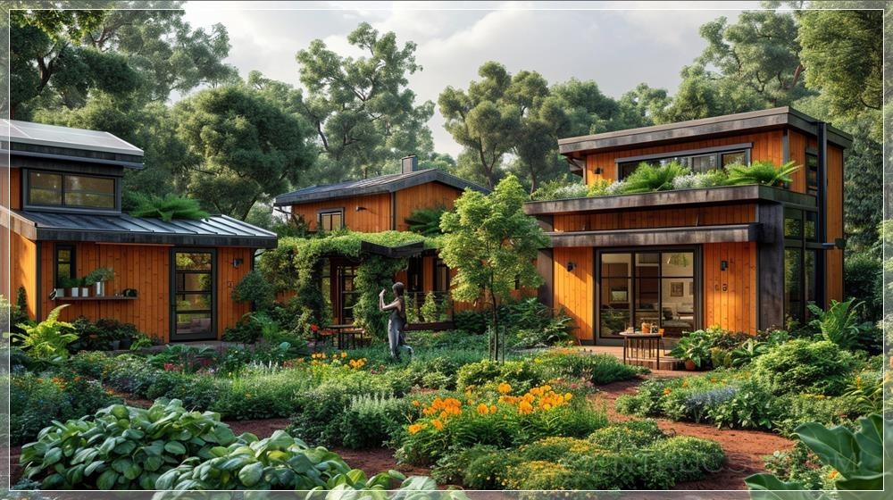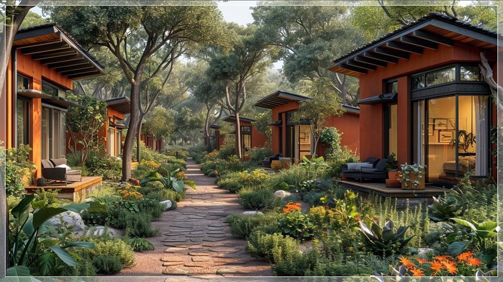 Create realistic photo of mixed race people in a suburban town within a Afro-modern tiny home community of 6 homes with eco friendly garden. The mulatto people are wearing athleisure clothing that represents a harmonious fusion of traditional rural American and black cultural heritage --v 6.0 --ar 16:9 --s 750