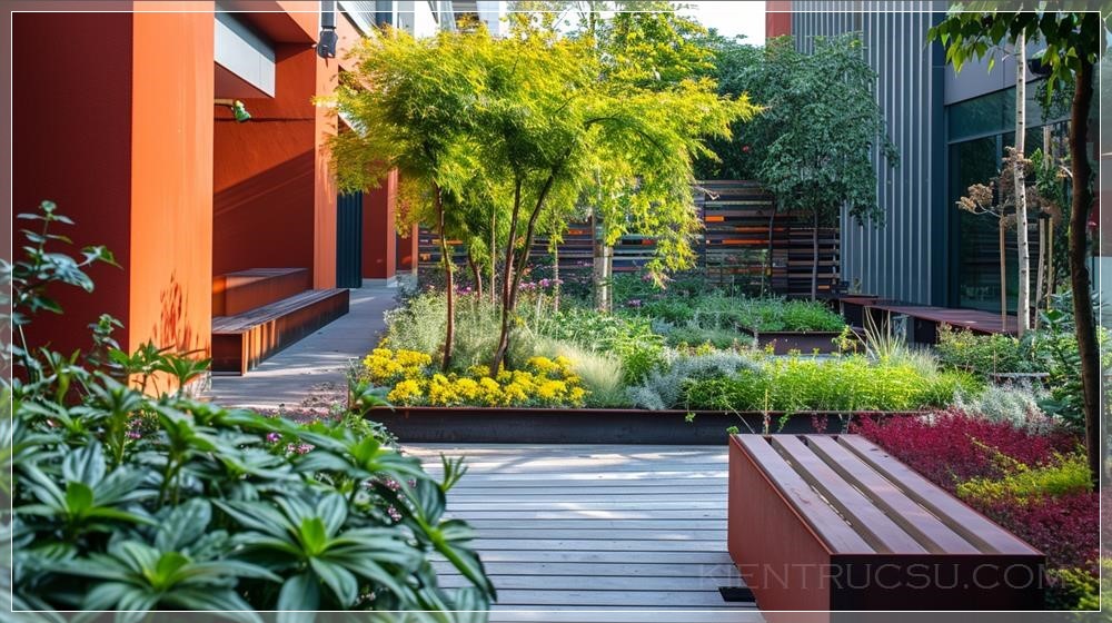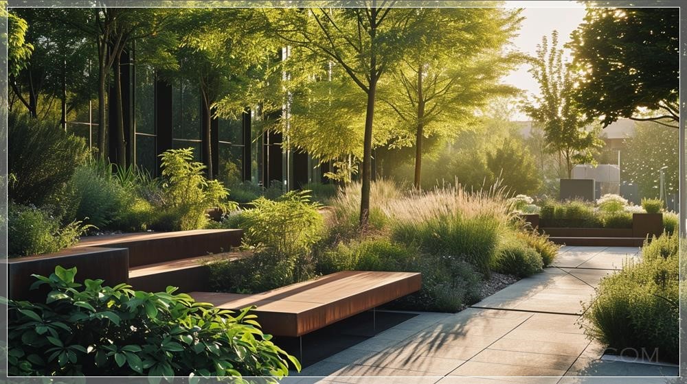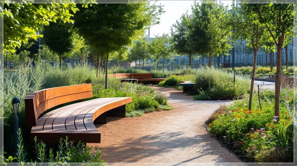 Photographie ultra-réaliste d'un espace vert innovant conçu par un architecte paysagiste à Toulouse, mettant en avant des installations modernes comme des bancs design, des structures d'éclairage intégrées, des jardins verticaux, et une variété de plantes incluant arbres, arbustes, et plantes florales. Intègre des solutions durables comme des systèmes de récupération d'eau de pluie et des zones de biodiversité. L'éclairage doux de fin d'après-midi souligne la convivialité et l'innovation du lieu. Vue en plongée pour capturer l'aménagement dans son intégralité, démontrant la cohérence et l'ingéniosité du design. --ar 16:9 --v 6.0