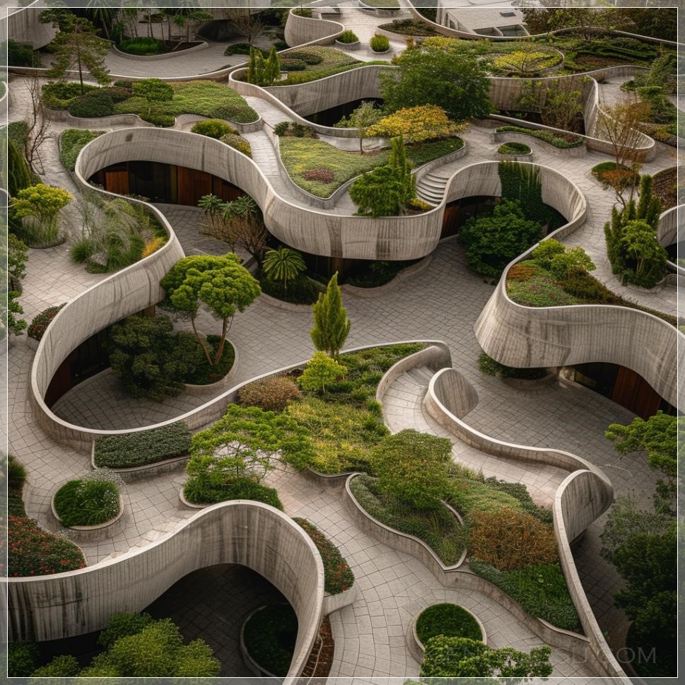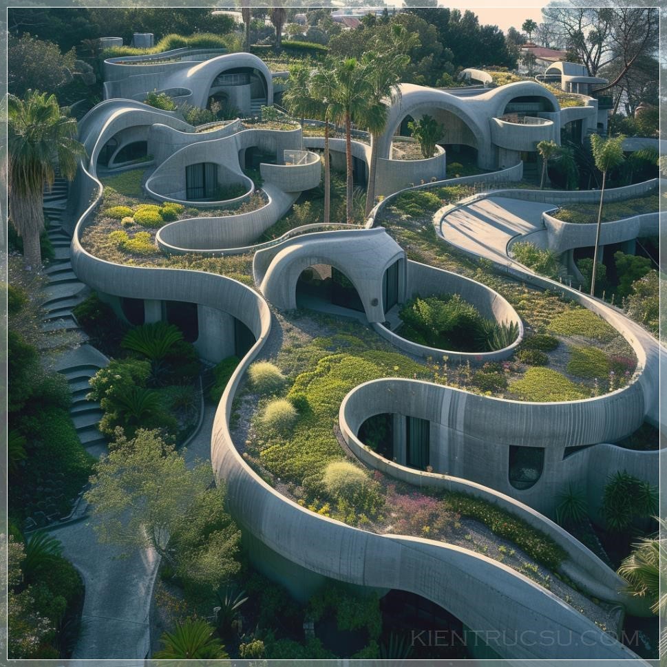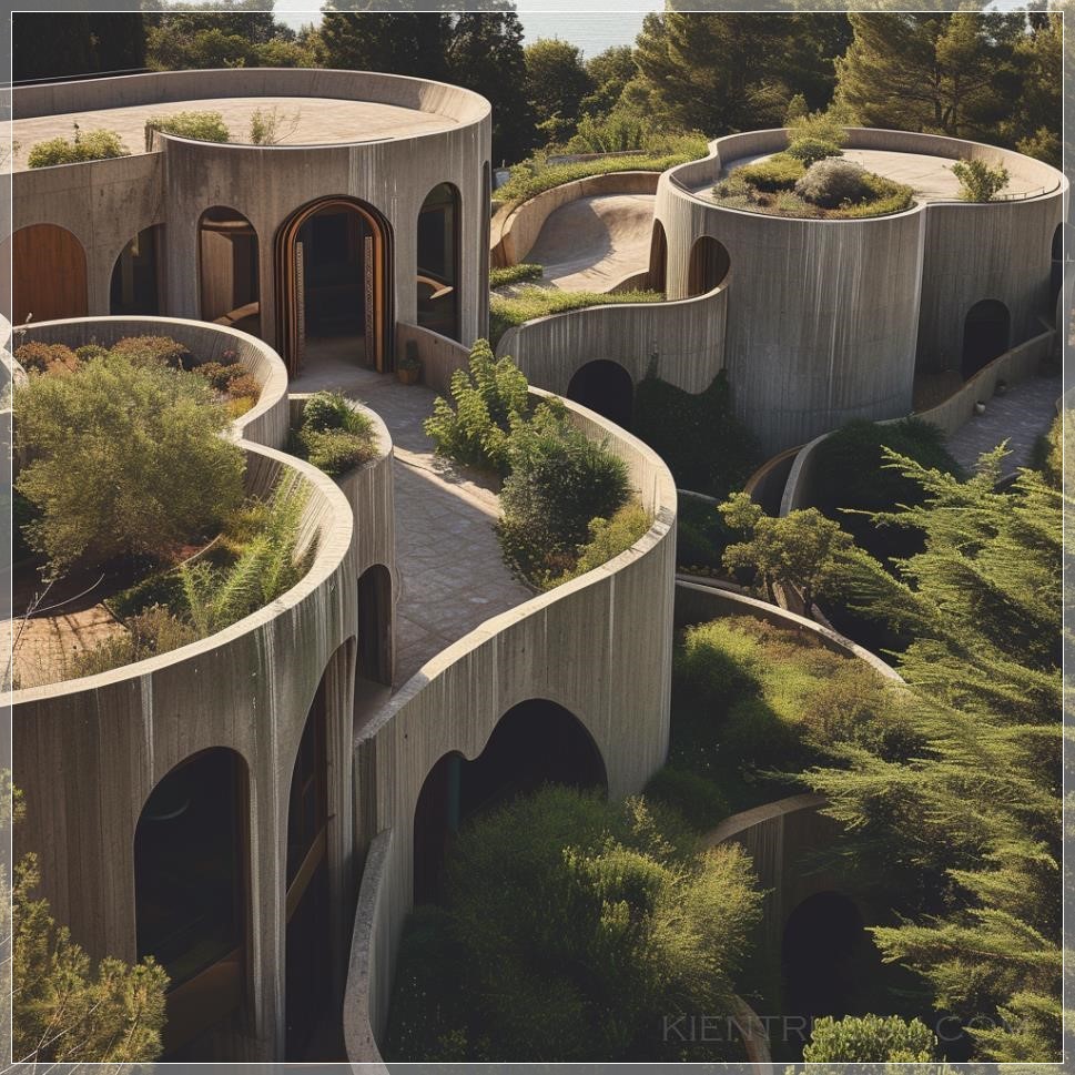 aerial view of interconnected smooth and curved concrete structures, ricardo bofill inspired, hardscape roofs with lush planting embedded inside, expansive views, award winning photography, color graded and desaturated --v 6.0 --style raw