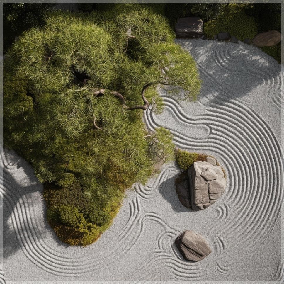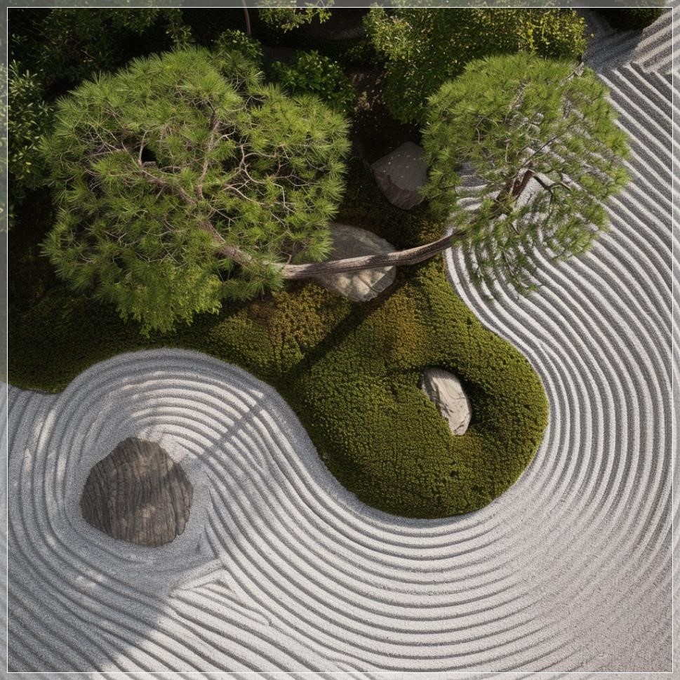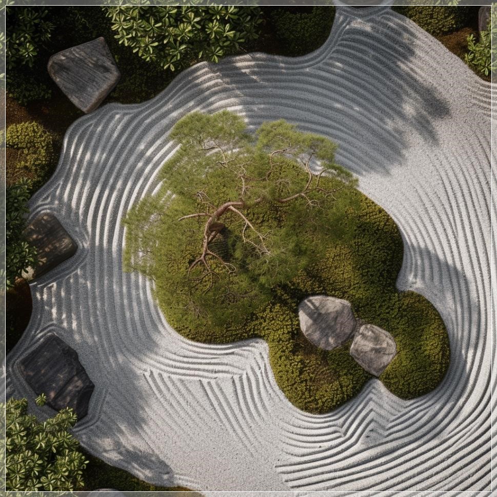 PROMPT: overhead shot of a japanese zen garden directly from above --v 6.0 --s 50 Ý Nghĩa: