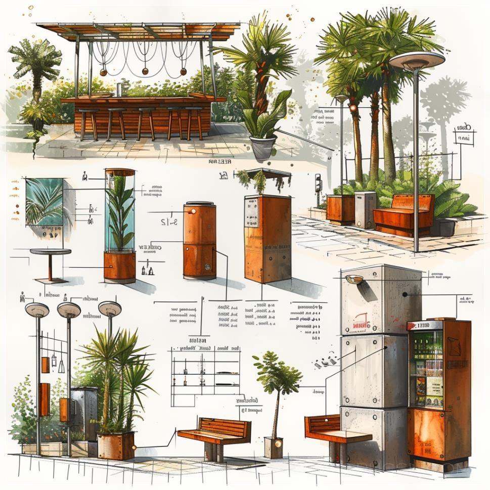 A design board of extremely detailed sketches or diagrams of street furniture, mosaic benches, colorful streetlamp, litter bins, requalification of the urban landscape of Kennedy town waterfront in Hong Kong with a tropical rain forest plants recreated with augmented reality, a relax experience for citizens in Hong Kong at Kennedy town waterfront with sea view, fines lines, extremely detailed furniture and bar counter, materials board with finishes, persons silhouettes, white background, in the style of geometric minimalist sculptures, whimsical cartoon-style, emotive lighting, unconventional forms, color materiality, bentwood, unique and one-of-a-kind pieces, --ar 1:1 --stylize 750 --v 6.0