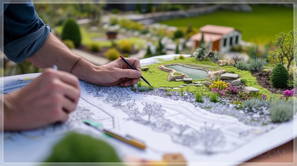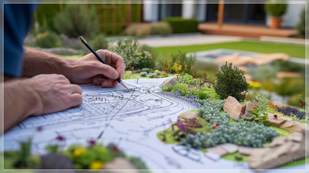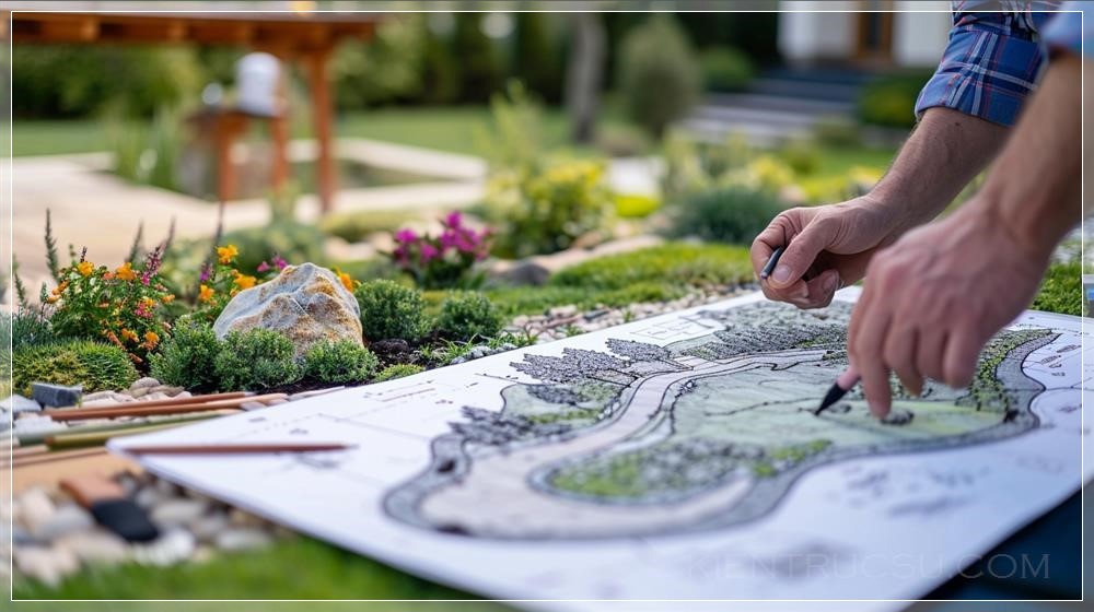 Imaginez une scène réaliste et engageante où un paysagiste concepteur professionnel est en pleine consultation personnalisée avec un client dans un jardin. Le paysagiste, équipé de plans et de croquis, discute activement avec le client, pointant vers différentes zones du jardin. Le jardin doit refléter un espace en cours de transformation, avec des zones déjà aménagées et d'autres encore en projet. Incluez des éléments comme un coin fleuri coloré, un espace de verdure tranquille, et peut-être un petit plan d'eau ou une sculpture de jardin. L'arrière-plan devrait montrer une maison résidentielle, soulignant le contexte d'un projet de paysagisme domestique. La lumière du jour doit être douce et chaleureuse, évoquant une atmosphère accueillante et créative. L'image doit capturer l'essence de la collaboration et de la personnalisation dans le processus de conception de paysages. --ar 16:9 --v 6.0