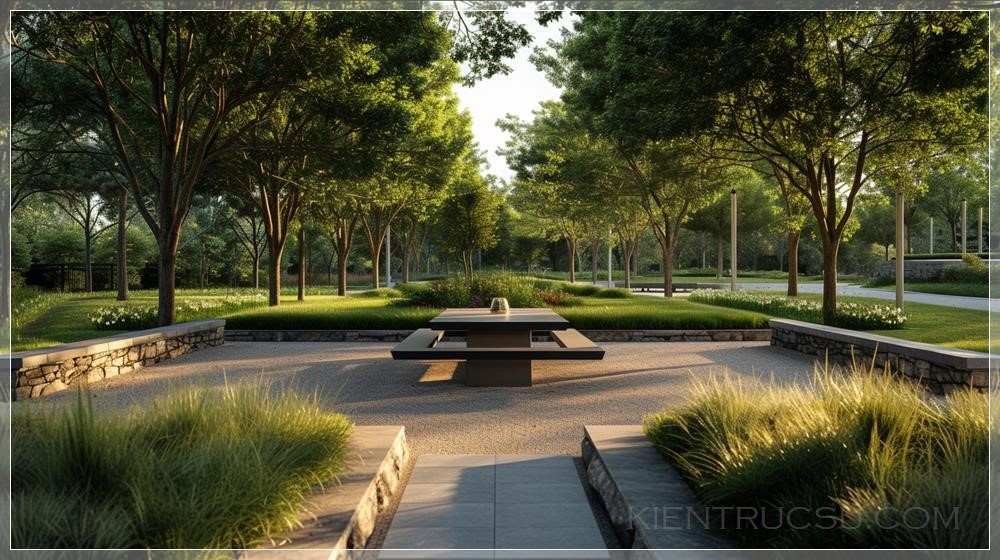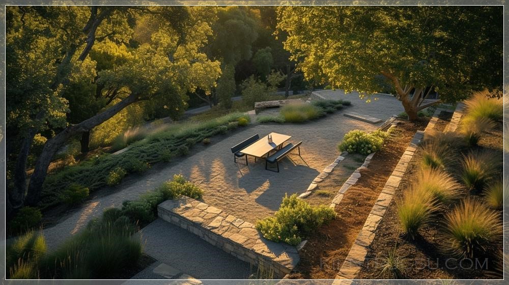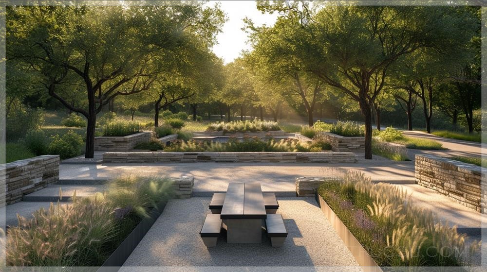 Large luxury community park centered around a bespoke dining table surrounded by trees. Use a Sony a7R IV camera with a 35mm lens shot a f5.6. High angle, low stone walls, idyllic, native grasses, golden hour, symmetrical, hyper-realistic, dark gray and green --ar 16:9 --v 6.0