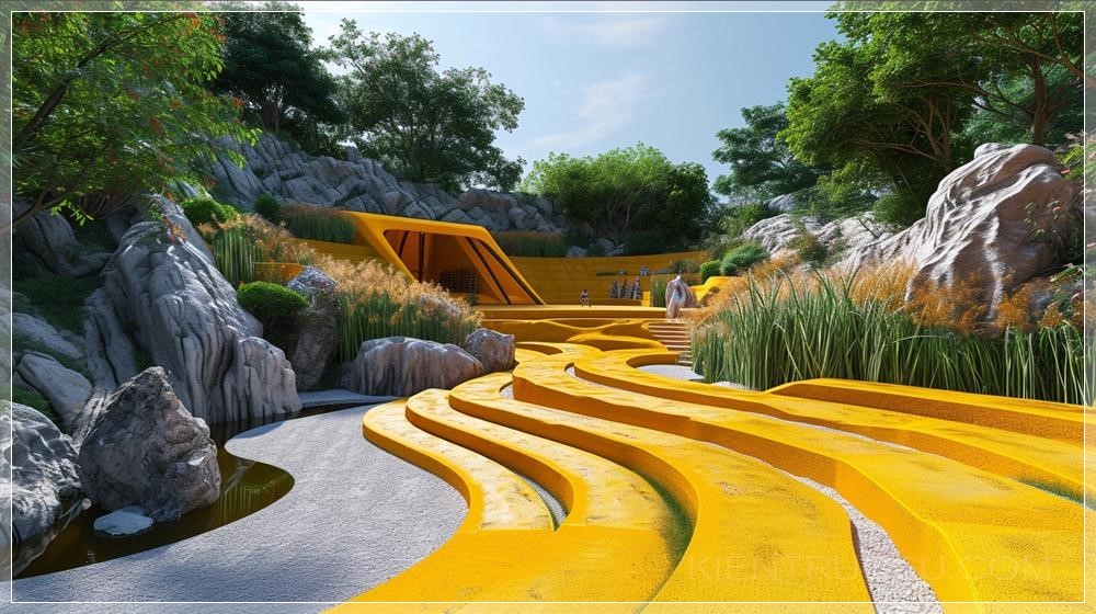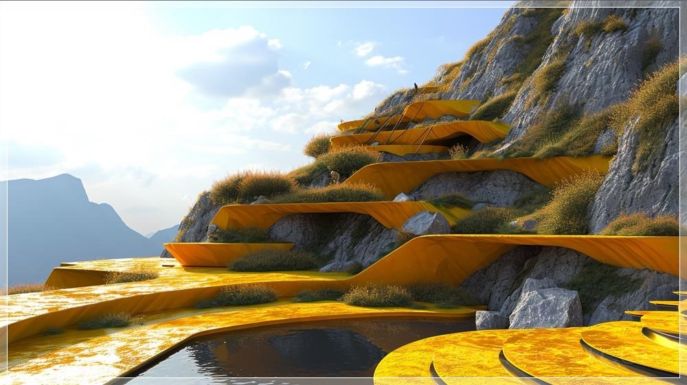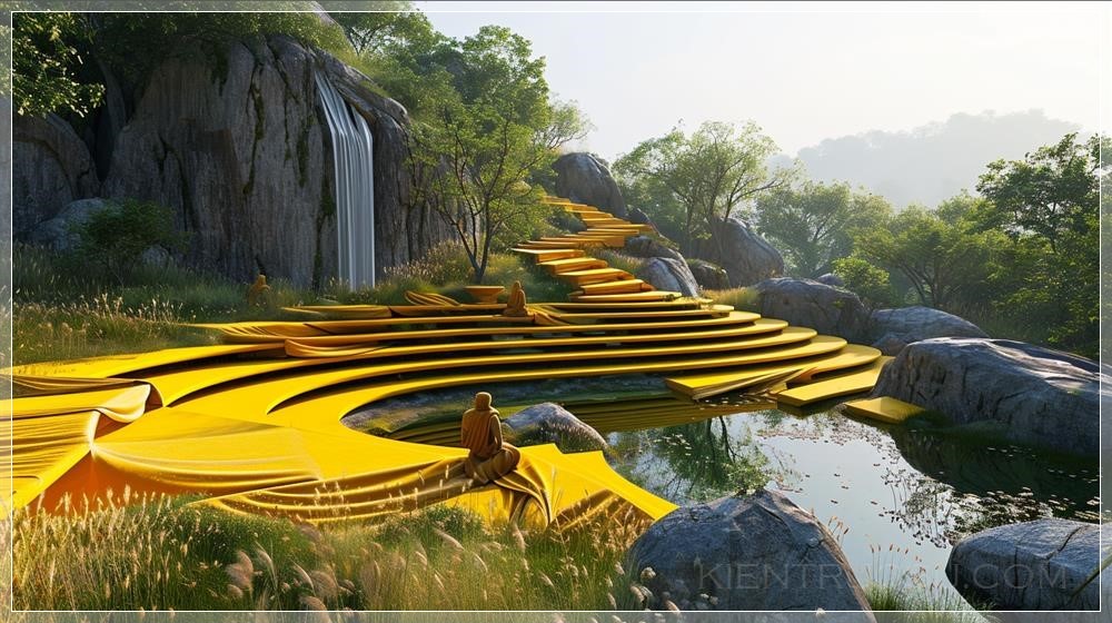 create an amphitheatre on a holy hindu mountain with stepped terraces, coloured in turmeric yellow, designed by zaha hadid, with beautiful natural landscaping, reed beds, rock sculptures as shrines, waterbody with steps, on a mountain, stretched fabric as roofing for the amphitheatre, parametriccore, ultra high definition, two point perspective, realistic high-definition, sharp focus, Super detailed --ar 16:9 --v 6.0
